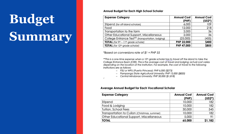 As our scholarship program gains momentum, the cost of sustaining and preparing our high school scholars has grown substantially. During the summer months, when scholars stay at the Self-Reliant Farm for five days each week, our food expenses increase sharply. Currently, our program provides food for the weekend for all scholars, with the need more than doubling during the summer months to meet the demands of their full-time stay. Additionally, preparing the scholars for tertiary education includes covering transportation and lodging expenses when they travel to take college entrance exams at universities beyond Culion. For many families, these expenses—such as inter-island ferry fares, overnight accommodations, and meals—are insurmountable without scholarship support. The investment in each scholar’s preparation is crucial to their success, as they face a highly competitive admissions process with limited local resources and guidance. By covering these costs, we aim to ensure that no scholar is hindered by financial barriers on their path to higher education.